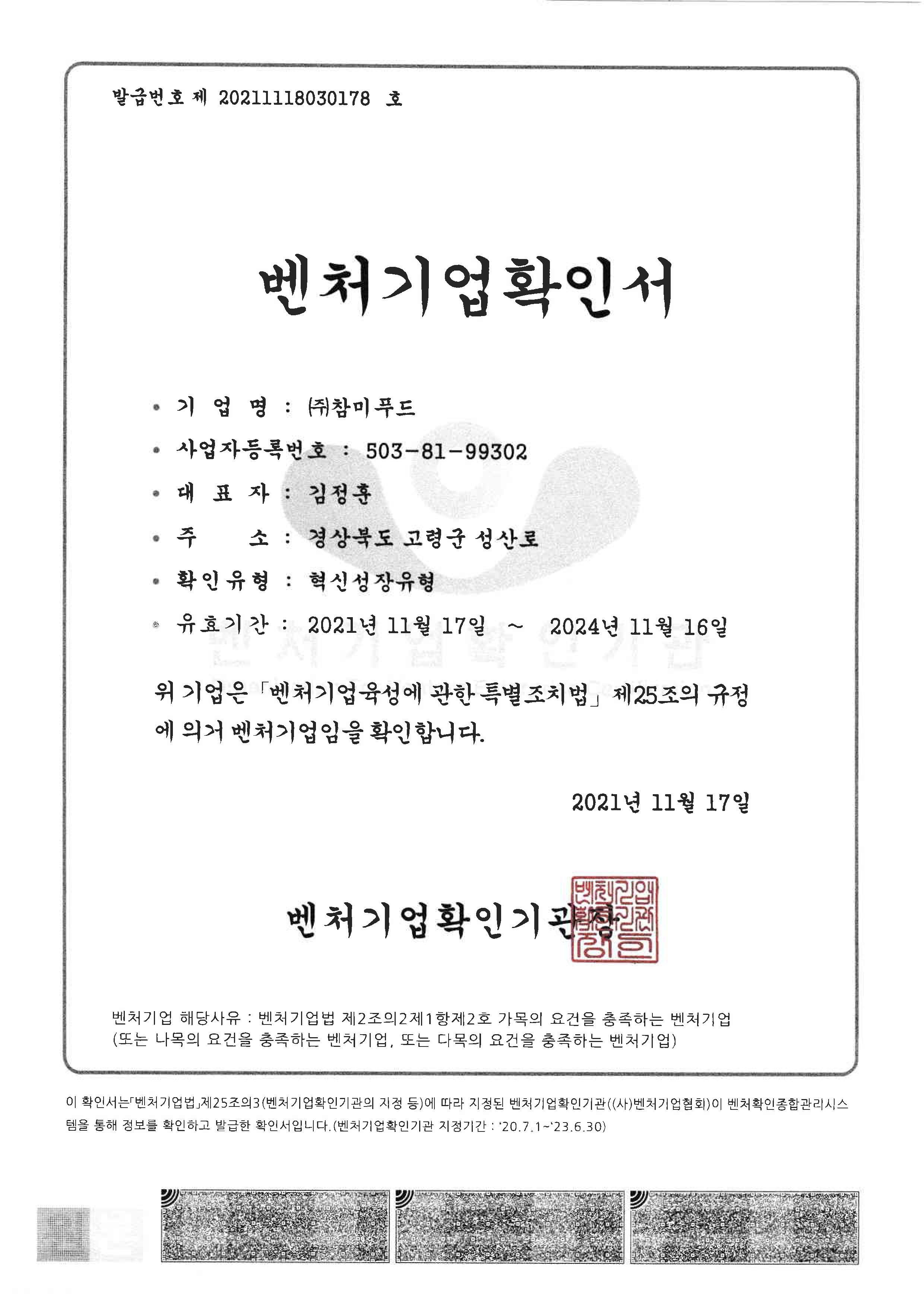 (주)참미푸드 벤처기업인증 작성자 (주)참미푸드 댓글 0 건 조회 35,495 회 작성일 21-11-25 09:21 저희 (주)참미푸드가 벤처기업확인기관으로 부터 혁신성장유형 기업으로 벤처기업 인증을 받았습니다. 목록 이전글 (주)참미푸드 이노비즈기업 인증 21.11.25 다음글 (주)참미푸드 굿즈 '밥토리' 출시 21.11.25