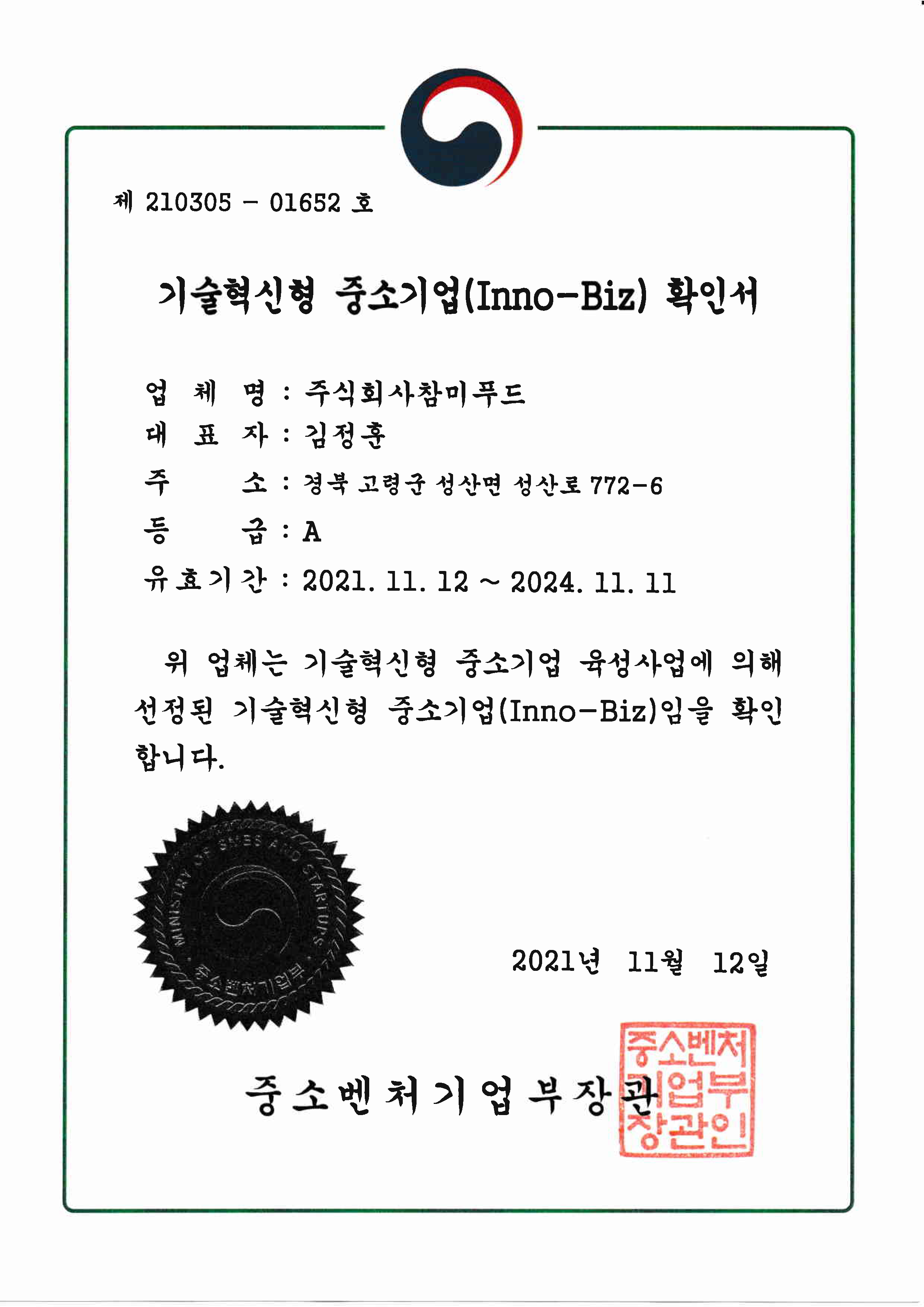 (주)참미푸드 이노비즈기업 인증 작성자 (주)참미푸드 댓글 0 건 조회 39,345 회 작성일 21-11-25 09:26 저희 (주)참미푸드가 중소벤처기업부장관 으로부터 기술혁신형 중소기업으로 이노비즈 인증을 받았습니다. 목록 이전글 (주)참미푸드 국제식품규격 ISO22000인증/ FSSC22000인증 획득 21.11.26 다음글 (주)참미푸드 벤처기업인증 21.11.25