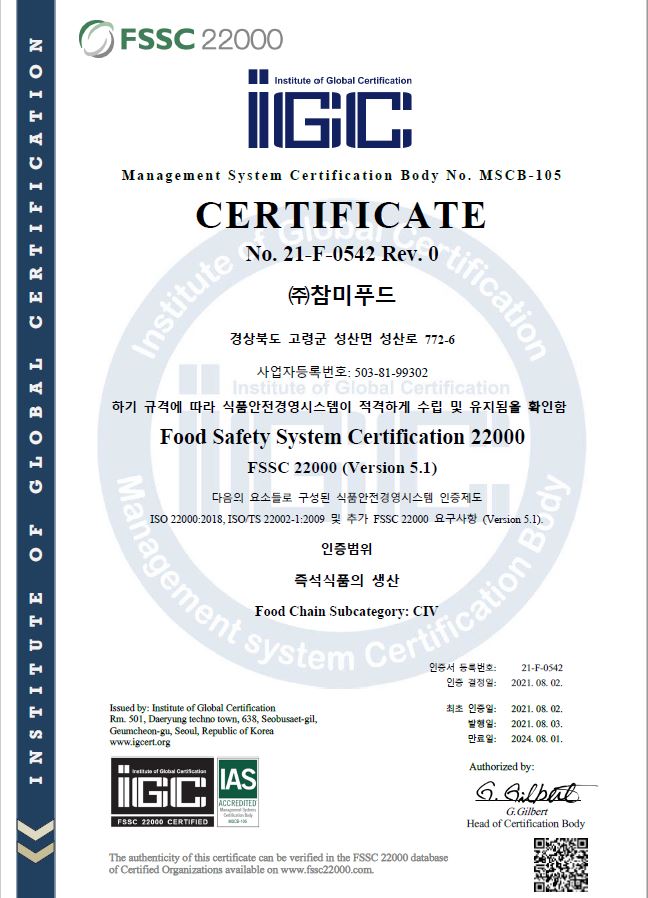 (주)참미푸드 국제식품규격 ISO22000인증/ FSSC22000인증 획득 작성자 (주)참미푸드 댓글 0 건 조회 82,187 회 작성일 21-11-26 10:46 저희 참미푸드가 ISO22000인증과 FSSC22000인증을 획득 하였습니다. 목록 이전글 (주)참미푸드- 경북중소기업대상 우수상 수상 21.12.28 다음글 (주)참미푸드 이노비즈기업 인증 21.11.25