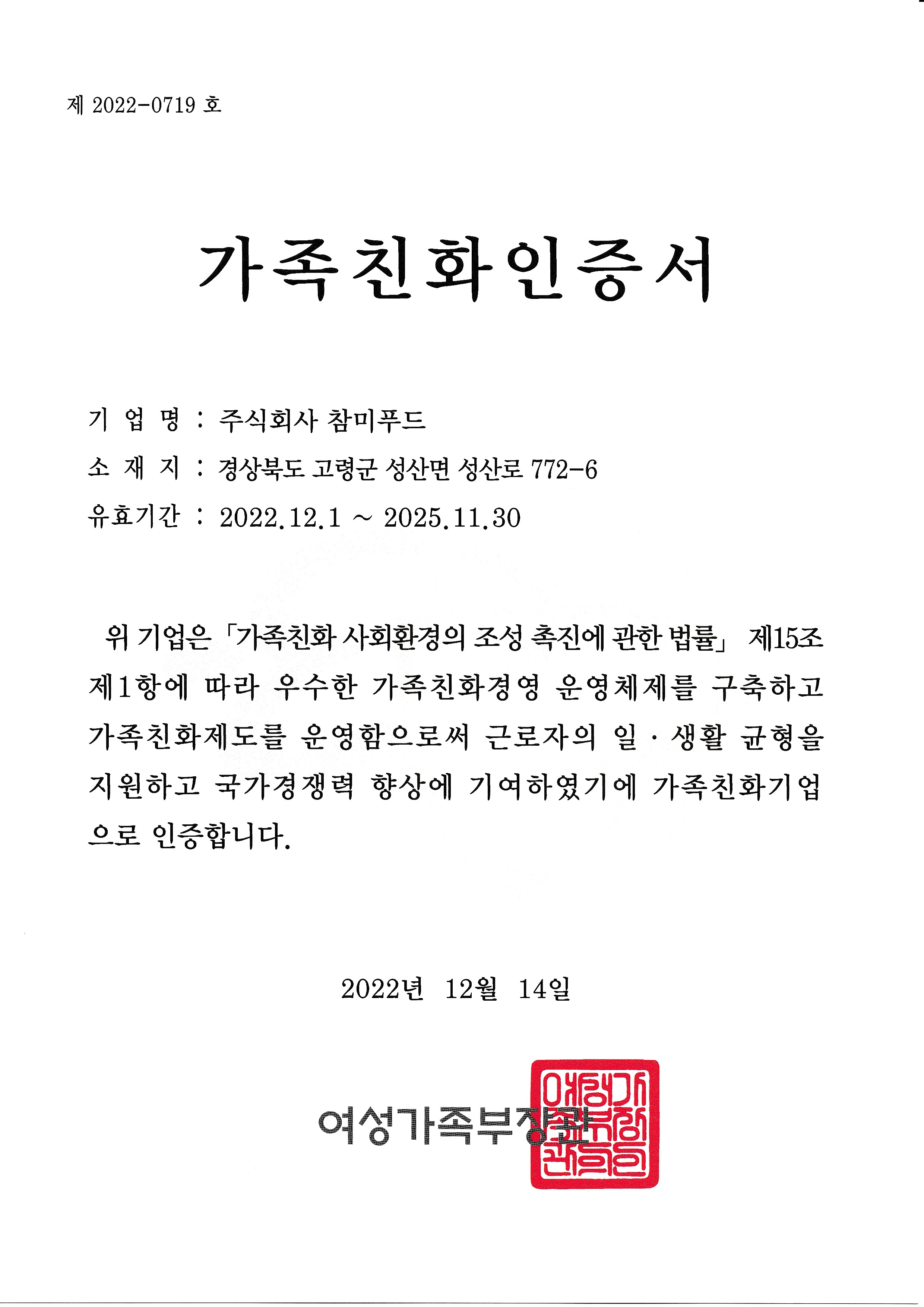 (주)참미푸드 가족친화기업 인증 작성자 (주)참미푸드 댓글 0 건 조회 68,904 회 작성일 23-01-03 10:16 저희 (주)참미푸드가 여성가족부장관 으로부터 가족친화기업 인증을 받았습니다. 목록 이전글 (주)참미푸드 - 월드비전2023 글로벌 6K 하이킹 협찬사 참여 23.03.20 다음글 (주)참미푸드- 경북중소기업대상 우수상 수상 21.12.28