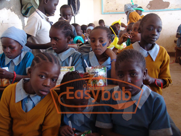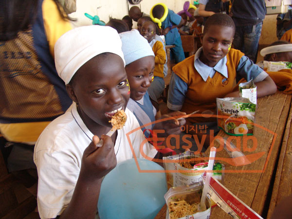 코피온에서 실시한 케냐 자원봉사에서 천진난만한 아이들에게 한국의 비빔밥을 선보이고 있습니다.