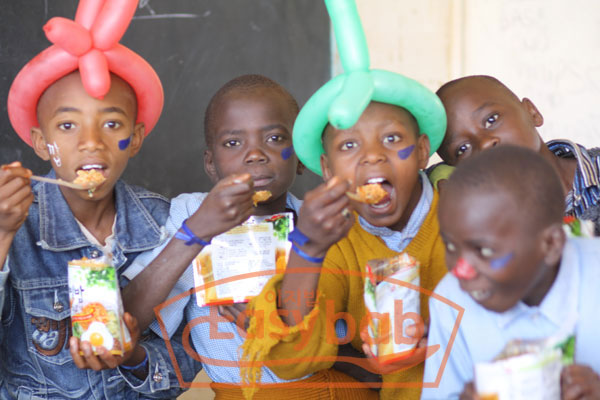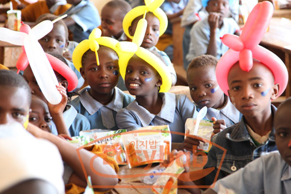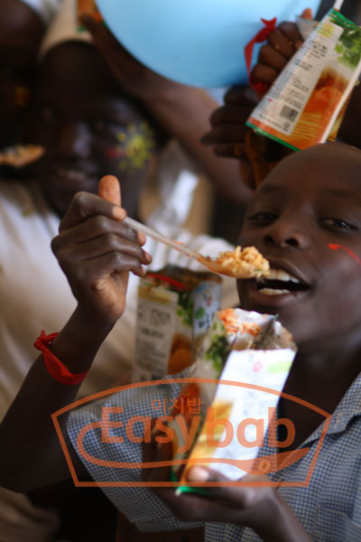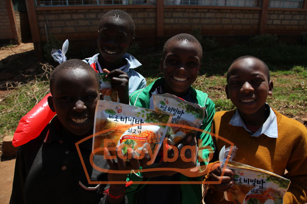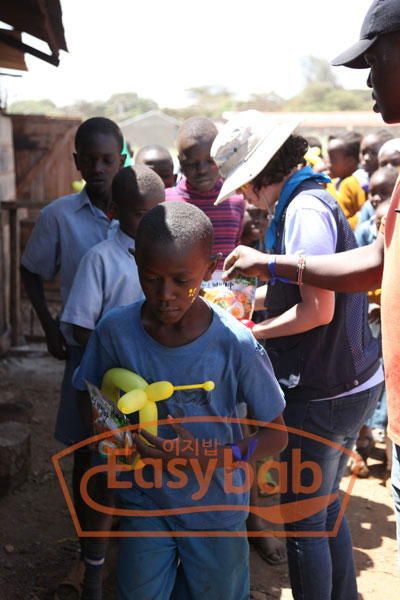 코피온에서 실시한 케냐 자원봉사에서 천진난만한 아이들에게 한국의 비빔밥을 선보이고 있습니다.